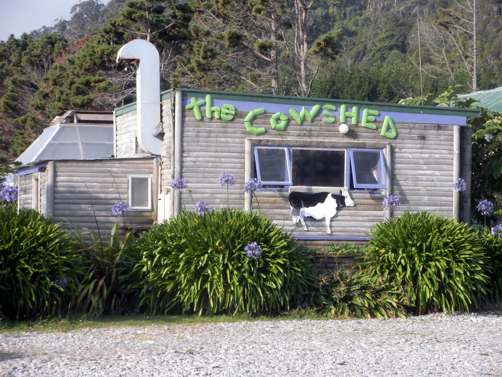 The photos always fail to live up to the actual beauty of the landscape, unless of course you are photographing road signs, then it is actually quite representative. Coming home Sunday evening we had made reservations to perhaps on of the world's most remote gourmet restaurants. The Cowshed cafe is situated halfway between Karamea and Westport, 45 KM from a town of 900 people and 45 km from a town of 8000 people, yet it was run by two young women with experience as private chefs in the Mediteranean.